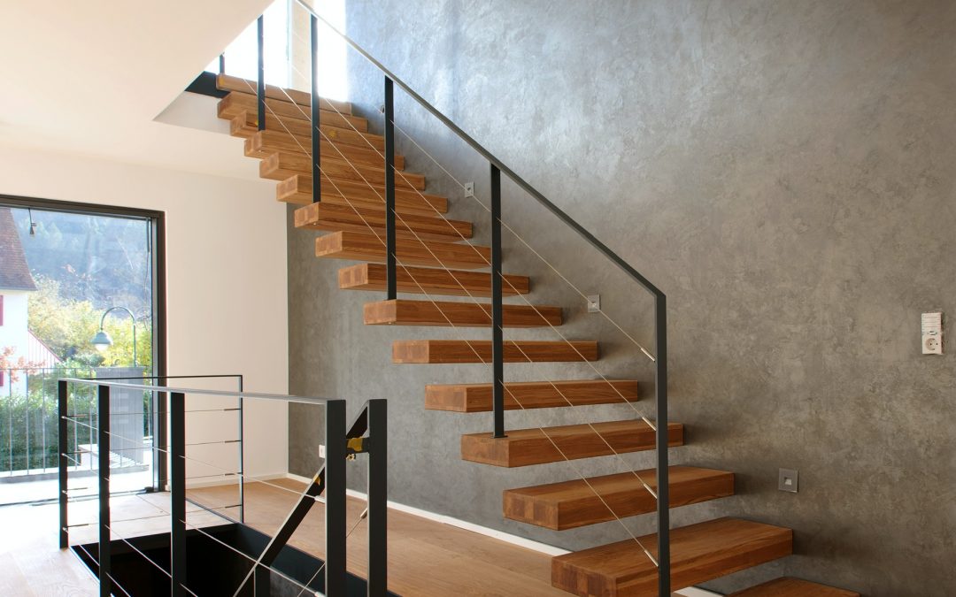 garde-corps horizontale autour de la trémie en acier plat laqué gris antracite et cable horizontal en inox autour d’une scalier autoporteur en bois