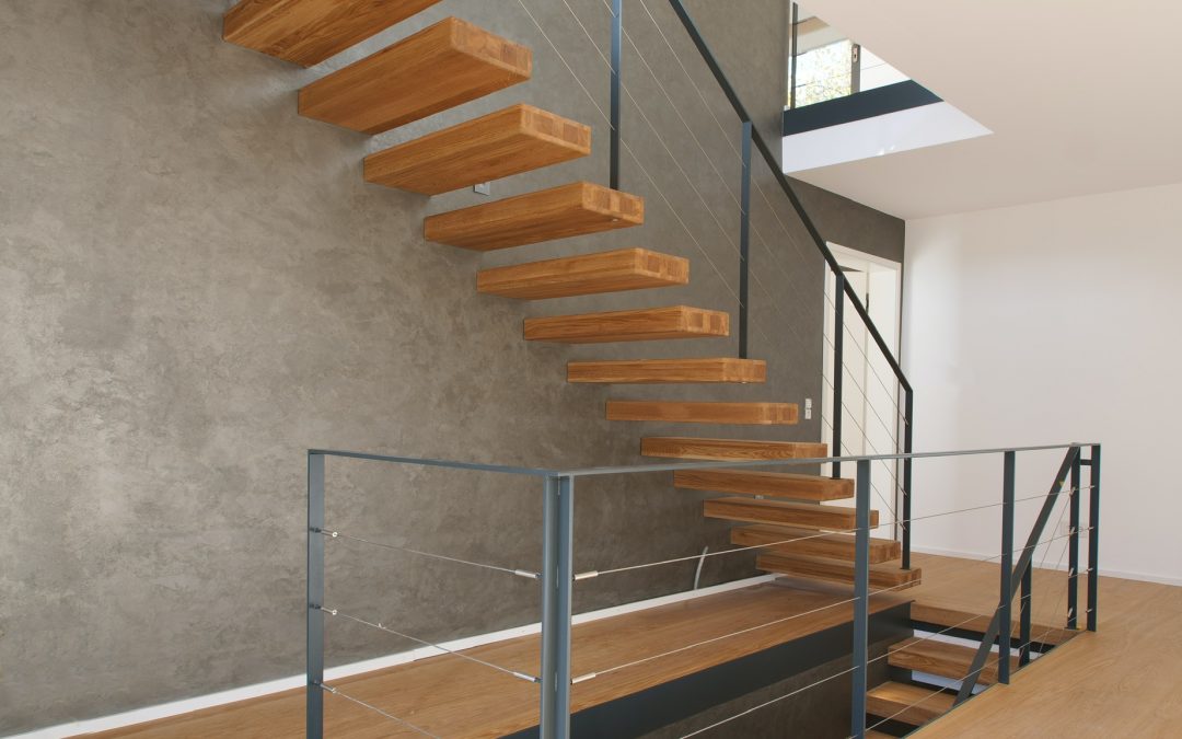 garde-corps horizontale autour de la trémie en acier plat laqué gris antracite et cable horizontal en inox autour d’une scalier autoporteur en bois