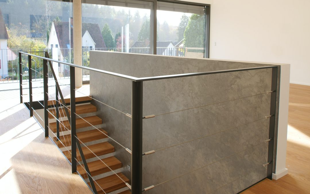 garde-corps horizontale autour de la trémie en acier plat laqué gris antracite et cable horizontal en inox autour d’une scalier autoporteur en bois