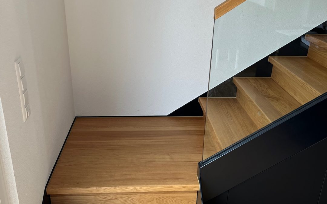 Escalier marche et contre marches en bois chêne entre limon bois laqué industriel et garde-corps en verre plein, finition main courante chêne, sans poteau