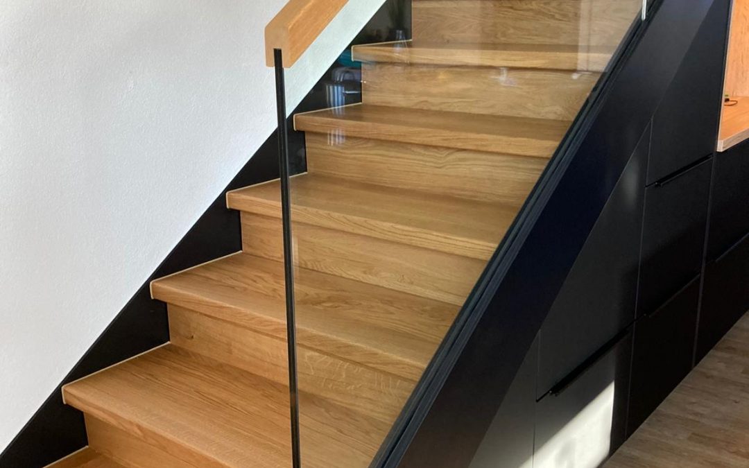 Escalier marche et contre marches en bois chêne entre limon bois laqué industriel et garde-corps en verre plein, finition main courante chêne, sans poteau