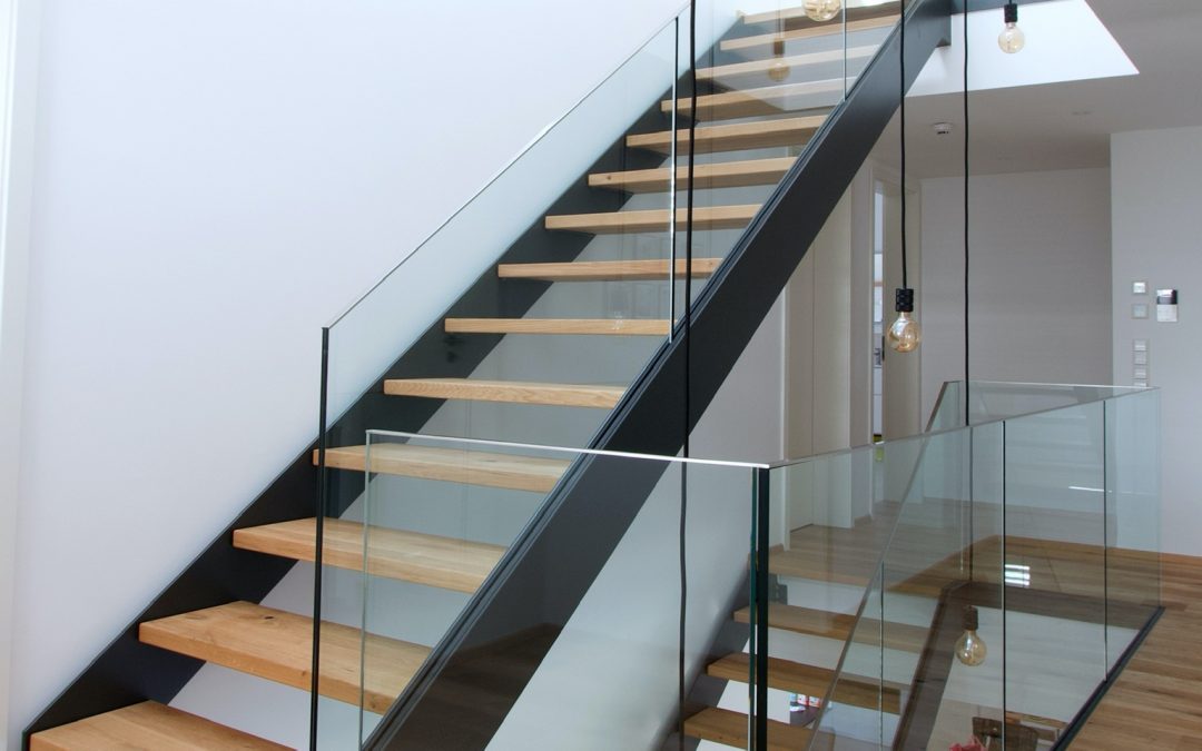 Escalier limon bois laqué tytpe industriel avec garde-corps full verre 16 mm sans poteaux marches en chêne
