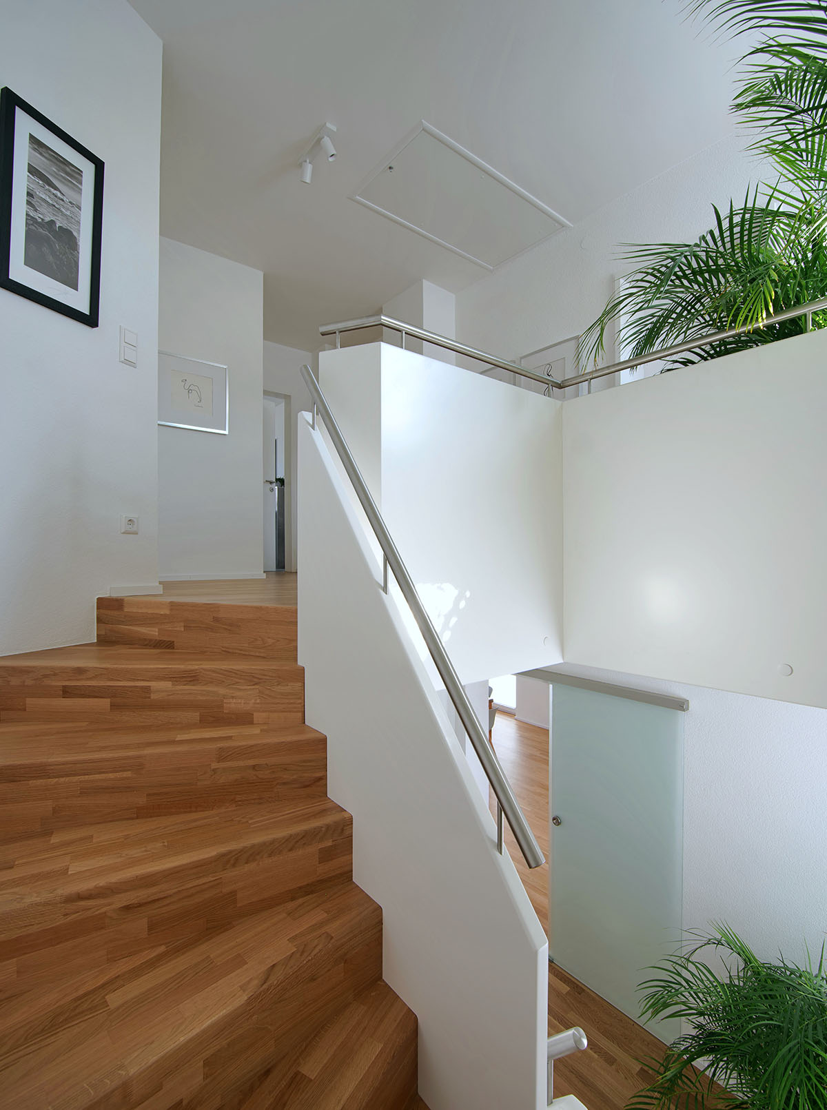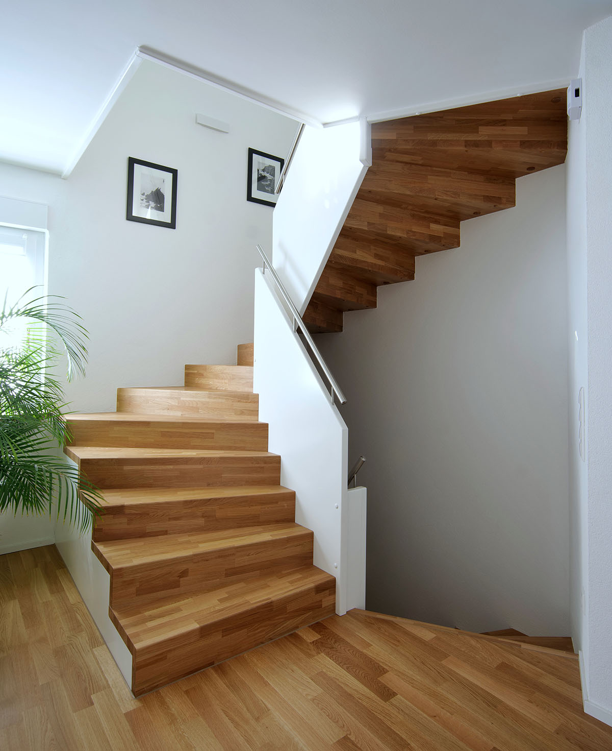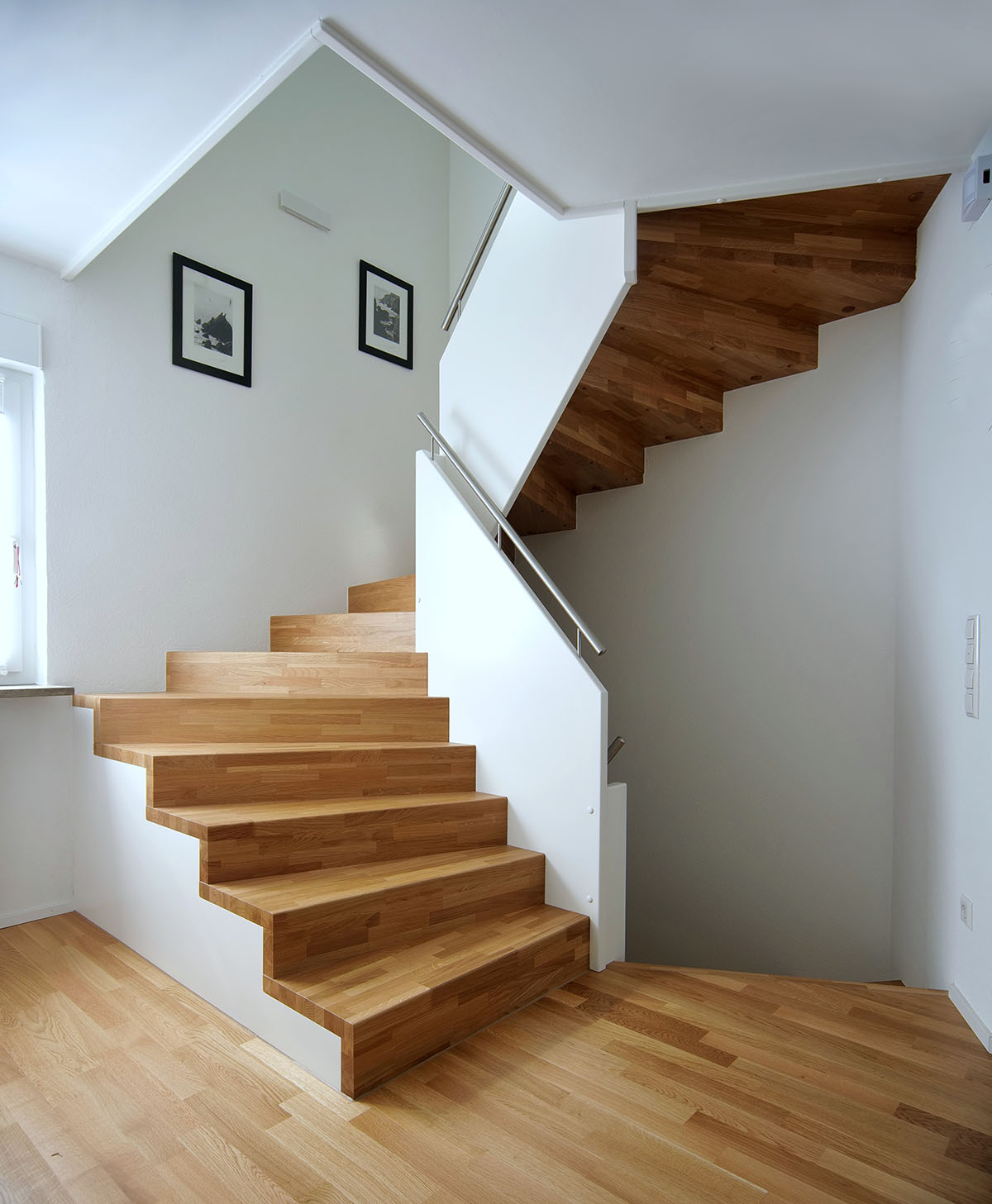 Chaque composant de cet escalier a été fabriqué avec une rigueur millimétrique au sein de l’atelier KIRNER TREPPENBAU en Allemagne. Nos menuisiers veillent à ce que la laque soit appliquée avec une régularité parfaite et que les assemblages entre le chêne et le bois plein soient invisibles. Ce niveau de finitions esthétiques est la garantie d’une installation silencieuse et d’un toucher soyeux, typique du savoir-faire « Made in Germany ».