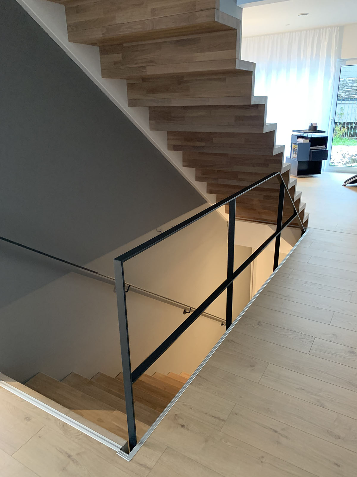 Réalisation à Wolfersdorf : l’escalier en chêne abouté et garde-corps acier plat