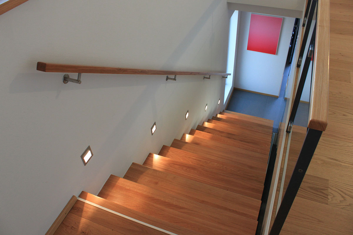 Chaque élément de cet escalier a été conçu et fabriqué dans notre atelier partenaire, KIRNER TREPPENBAU, en Allemagne. L’expertise de nos menuisiers garantit des assemblages parfaits entre les marches en bois et les panneaux de verre. Ce niveau de finitions esthétiques est le fruit d’une fabrication artisanale rigoureuse, assurant la pérennité et la stabilité de l’escalier au fil des années.