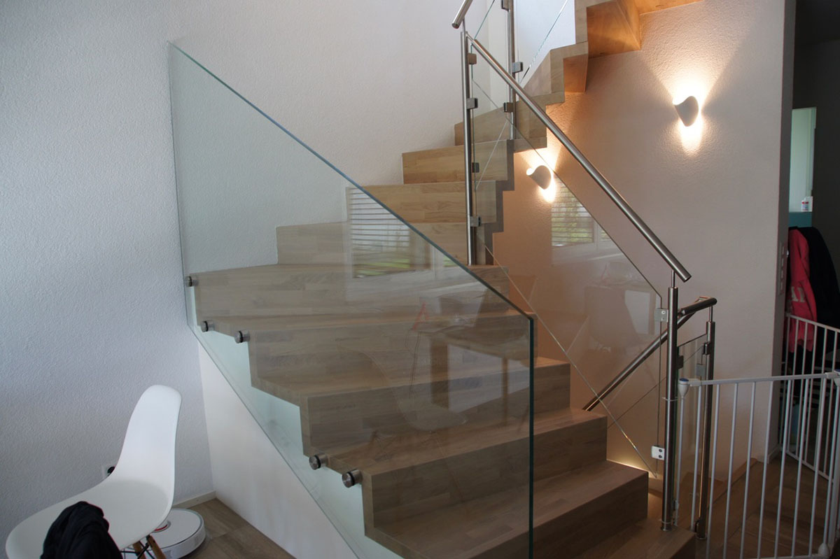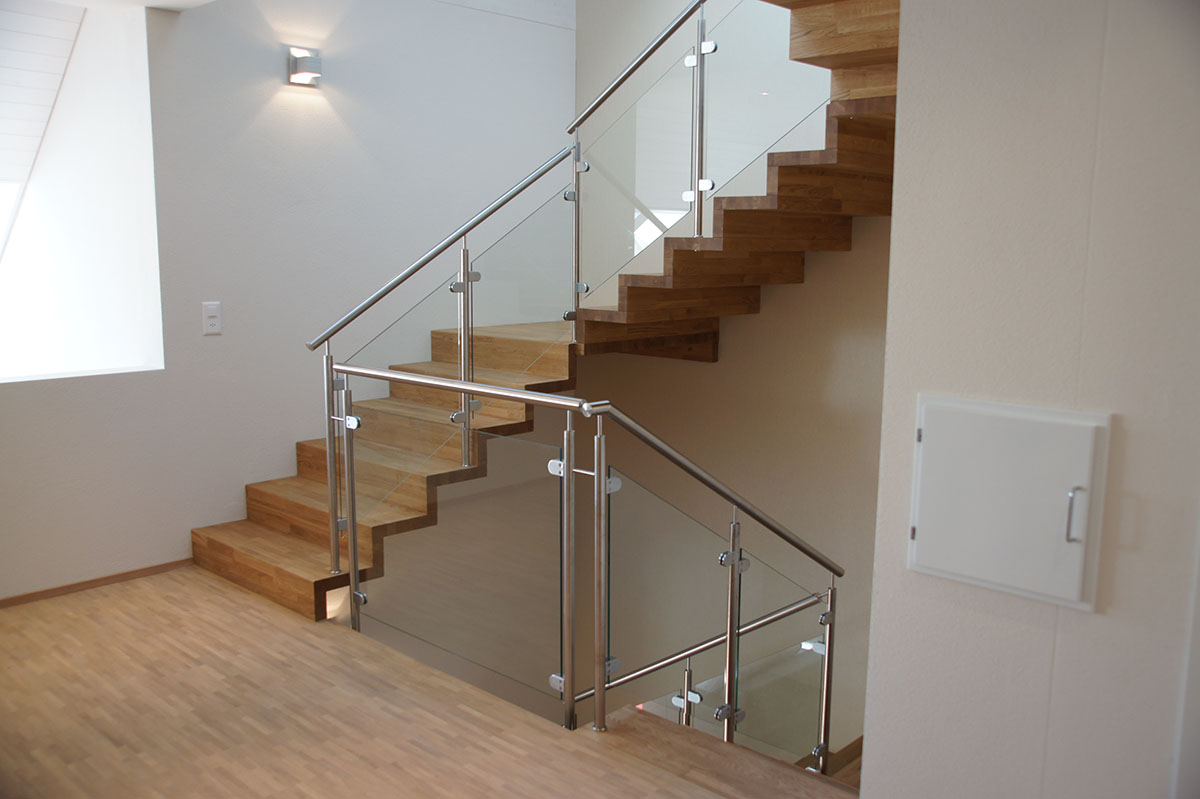 Pour sécuriser cet ouvrage complexe tout en conservant une sensation d’espace, le choix s’est porté sur un garde-corps en inox. La structure métallique, fine et robuste, est complétée par un remplissage en verre. Cette transparence totale permet à la lumière naturelle de traverser l’escalier, mettant en valeur le veinage du chêne et évitant d’assombrir la zone de passage. L’alliance de l’inox brillant et du verre crée un contraste résolument moderne avec la noblesse du bois.