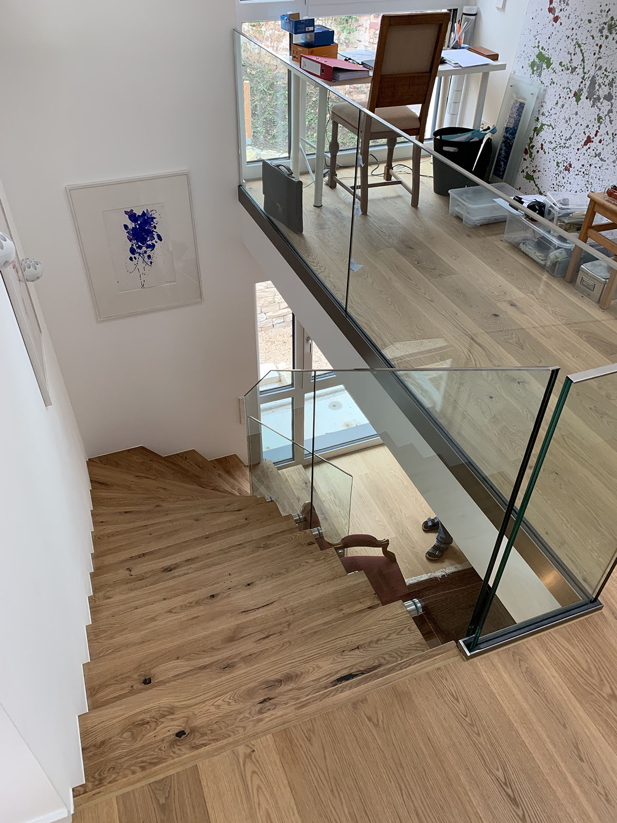 Réalisation à Sainte-Marie-aux-Mines : triple escalier en chêne fumé et garde-corps full verre