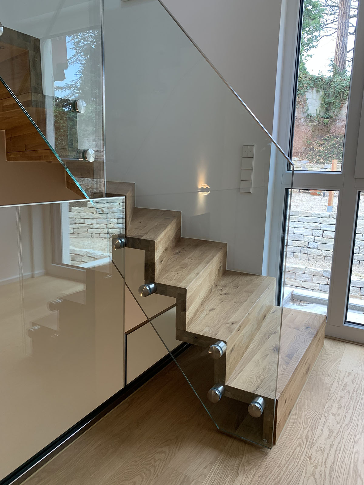 Escalier moderne à Sainte-Marie-aux-Mines: trois escaliers marche et contremarches chêne fumé avec leur garde-corps full verre