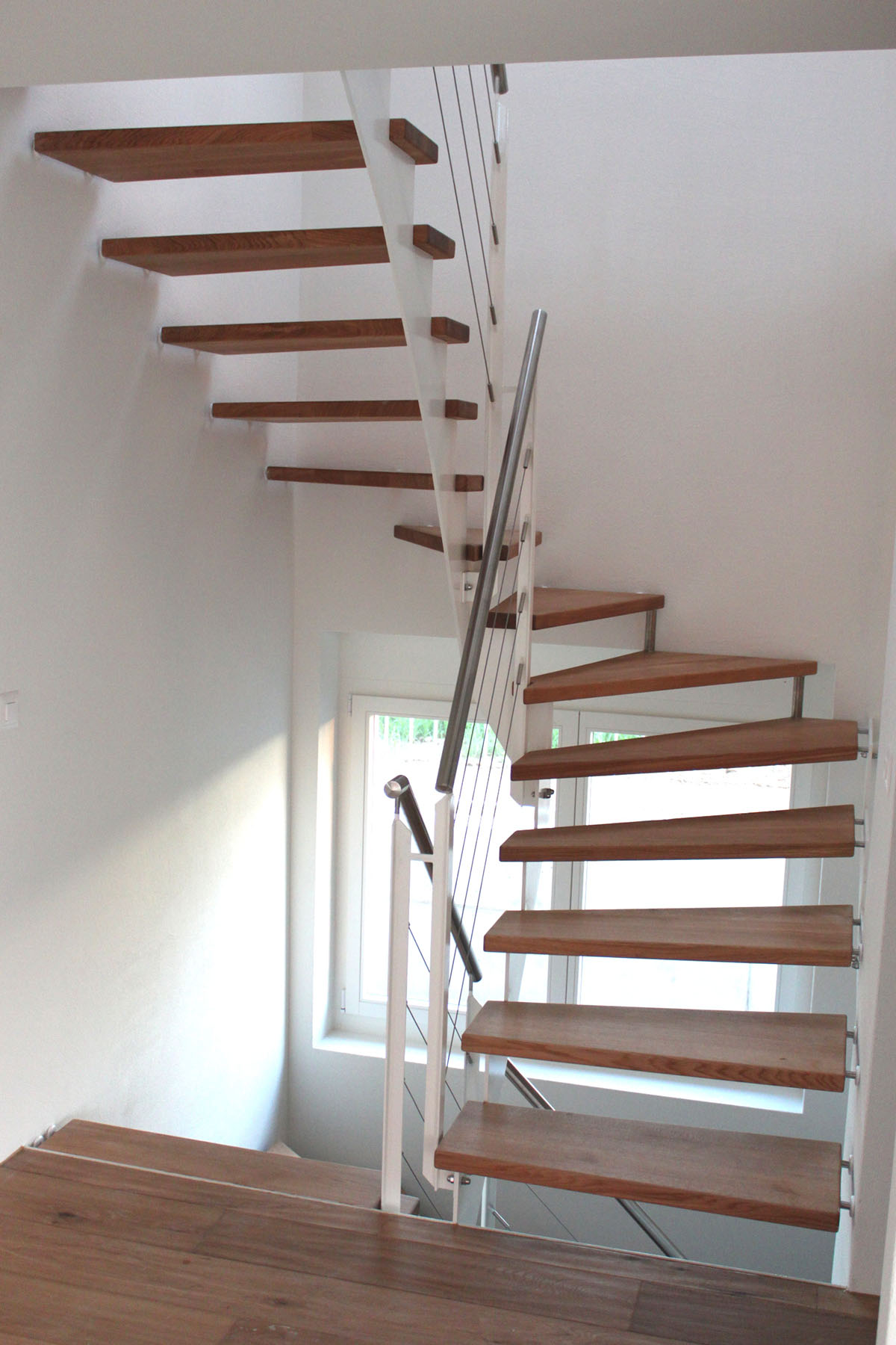 Un escalier suspendu avec limon crémaillère exige une rigueur millimétrique. Chaque composant a été fabriqué au sein de l’atelier KIRNER TREPPENBAU en Allemagne. Nos menuisiers et soudeurs collaborent pour assurer des ancrages invisibles et des finitions esthétiques de haut niveau. Ce savoir-faire garantit un ouvrage parfaitement stable, silencieux et capable de traverser les années sans aucune déformation.