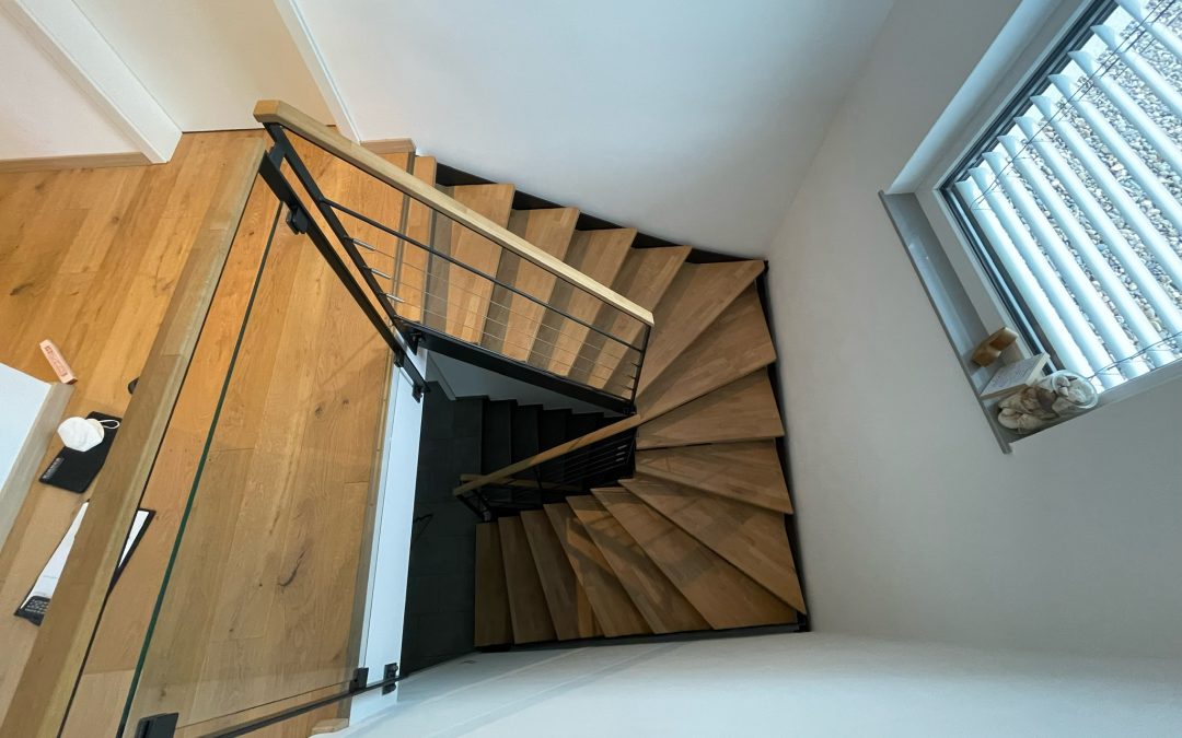 Escalier moderne bois métal type industriel avec limon en acier laqué, garde-corps en fer plat et finition main courante bois soudé et remplissage cables inox et verre en aprtie basse