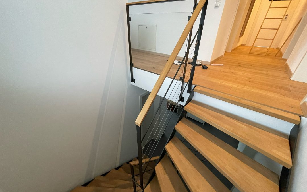 Escalier moderne bois métal type industriel avec limon en acier laqué, garde-corps en fer plat et finition main courante bois soudé et remplissage cables inox et verre en aprtie basse