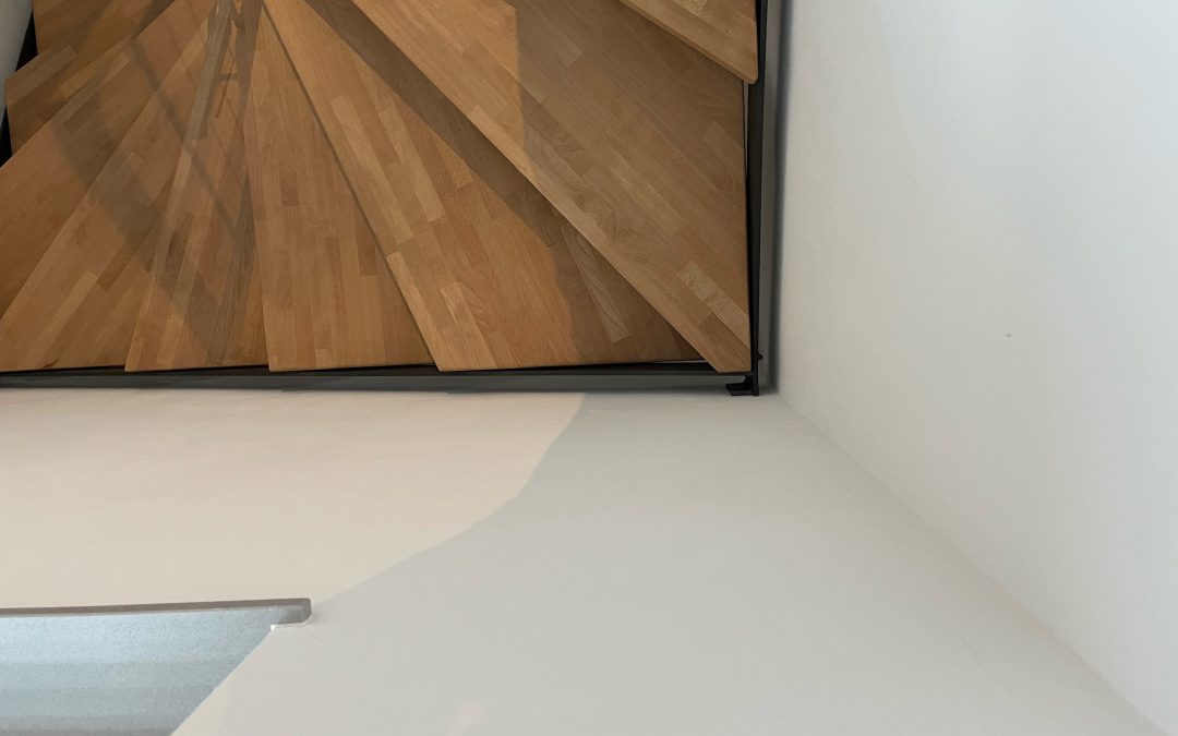 Escalier moderne bois métal type industriel avec limon en acier laqué, garde-corps en fer plat et finition main courante bois soudé et remplissage cables inox et verre en aprtie basse