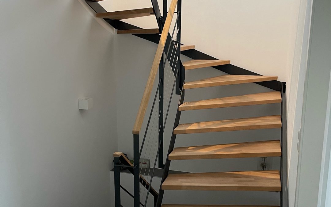 Escalier moderne bois métal type industriel avec limon en acier laqué, garde-corps en fer plat et finition main courante bois soudé et remplissage cables inox et verre en aprtie basse