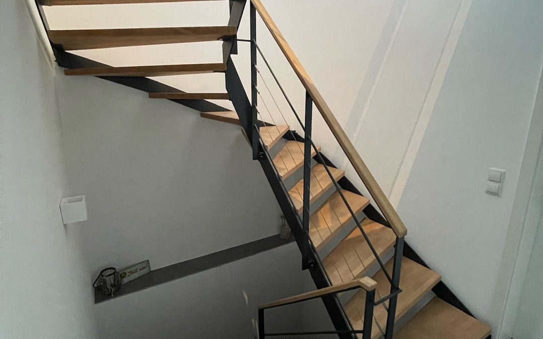 Escalier moderne bois métal type industriel avec limon en acier laqué, garde-corps en fer plat et finition main courante bois soudé et remplissage cables inox et verre en aprtie basse