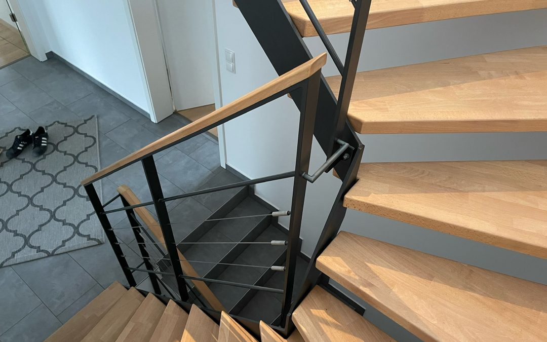 Escalier moderne bois métal type industriel avec limon en acier laqué, garde-corps en fer plat et finition main courante bois soudé et remplissage cables inox et verre en aprtie basse