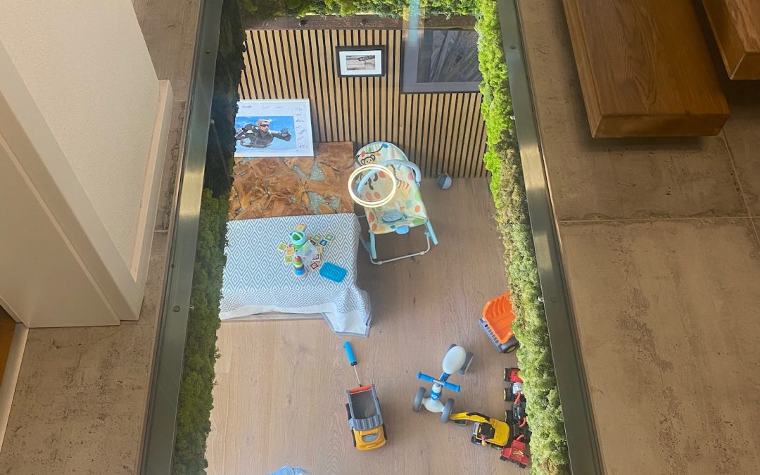 Pallier en verre à l’étage sur chantier d’un Escalier autoporteur suspendu et garde-crops rampant et horizontal full verre sans poteaux